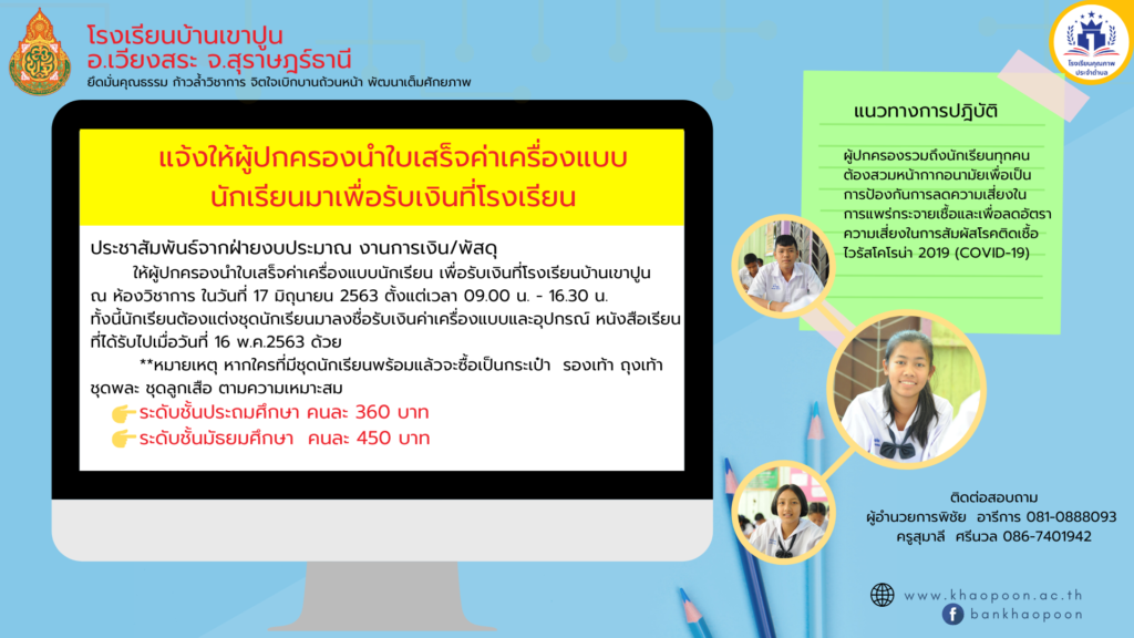 ประชาสัมพันธ์ จากฝ่าบงบประมาณ งานการเงิน/พัสดุ เรื่อง แจ้งให้ผู้ปกครองนำใบเสร็จค่าเครื่องแบบนักเรียน มาเพื่อรับเงินที่โรงเรียนบ้านเขาปูน ณ ห้องวิชาการ ในวันที่ 17 มิถุนายน 2563 ตั้งแต่เวลา 09.00 น. ถึง 16.30 น. ทั้งนี้นักเรียนต้องแต่งชุดนักเรียนมาลงชื่อรับเงินค่าเครื่องแบบและอุปกรณ์ หนังสือเรียน ที่ได้รับไปเมื่อวันที่ 16 พ.ค.2563 ด้วย